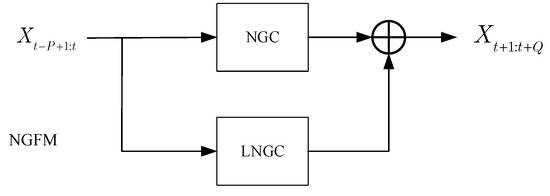 As can be seen in Figure 3, the output of the NGFM is determined by the output of both the NGC and the LNGC. Let the output of the NGC be , and the output of the LNGC be . The final output of the model NGFM is shown in Formula (8) where , are the weights and is the bias.