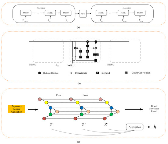 The composition of the NGC module, (a) the structure of the encoder–decoder model, (b) the structure of NGRU, (c) the structure of adaptive graph convolution.