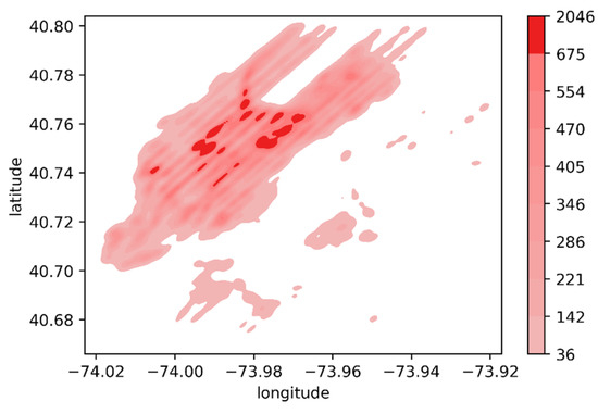 Figure 5 shows the spatial kernel density distribution of taxi ridership data for the New York taxi dataset in April 2016. We use the horizontal and vertical axes to represent longitude and latitude, and darker colors indicate more demand in the area. The figure shows that taxi demand is distributed in a stepped pattern, with no dramatic changes of demand in adjacent areas, which indicates that demand is distributed spatially in proximity.