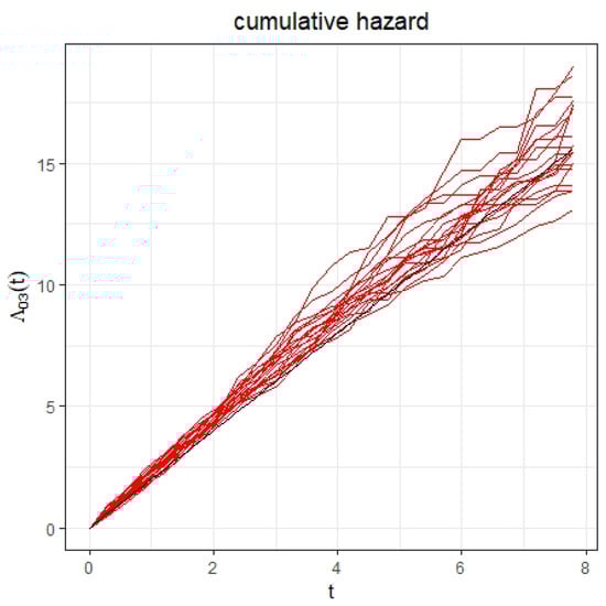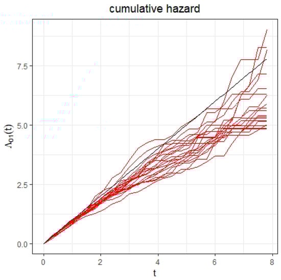 Furthermore, we plot the estimated cumulative baseline hazard function and by the proposed method based on 20 replications (with red color) together with the true cumulative baseline hazard function and (with black color) under the model with gamma frailty in Figure 1 and Figure 2 with sample size 500. Since both cumulative baseline hazard functions and have the same expression, here, we only plot the estimated cumulative baseline hazard function .