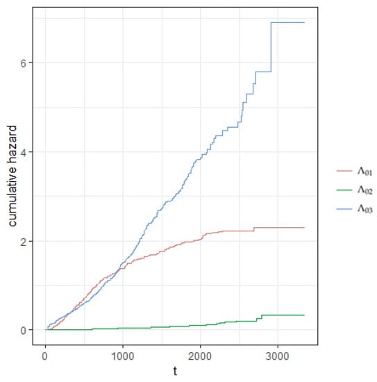 In addition, the 95% bootstrap CI from Table 4 is constructed using and quantiles of with . As shown in Table 4, the treatment with therapy Lev+5-FU can significantly reduce the probability of occurrence of recurrent event. However, we can observe that this therapy has little effect to the decrease in mortality. Both and have a p-value around 0.4, which indicates the insignificance of these two parameters. The cumulative hazard rate for different transitions are presented by Figure 3 and it indicates that a patient who experiences the recurrence of this disease will have very high mortality rate in the following years. In addition, we also observe the high hazard rate for the recurrence of colon cancer, which shows the importance of therapies such as Lev+5-FU, which can significantly reduce the occurrence of such event.