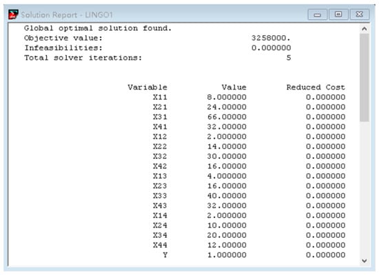 LINGO 11 software (developed by Lindo System Inc. located in Chicago, IL, USA) is used to write and solve the program for the human resources optimal allocation model. The results of the program operation are shown in Figure 1.
