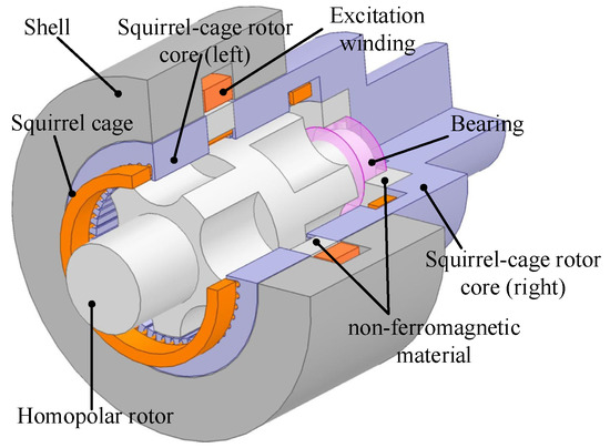 A three-dimensional view of the proposed HTR-ASD is shown in Figure 2. It is composed of a homopolar-type rotor, a squirrel-cage rotor and a non-rotary shell with an excitation winding. The squirrel-cage core is formed by laminated silicon steel sheets and embedded with a squirrel cage whose middle part is composed of non-ferromagnetic material. The homopolar-type rotor is fabricated with high-strength solid steel. The shell and the excitation winding are the non-rotary parts of the machine.