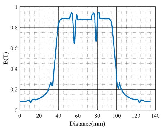 To simplify the calculation, the air gap performance function can be considered. The authors of [27] use the rotor shape function to represent the air gap performance function. However, according to the hypothesis of the equal magnetic potential plane, the air gap magnetic field is perpendicular to the rotor surface. Figure 7a shows the axial view of the HTR-ASD, and Figure 7b shows the no-load magnetic density distribution within one rotor tooth pitch. Obviously, the air gap magnetic density waveform is very different from the rotor slot shape.