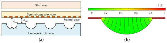 The excitation winding provides the flux for the HTR-ASD. The flux is closed through the shell, the air gap between the shell and the squirrel-cage rotor, the squirrel-cage rotor core, the air gap between the squirrel-cage and the HTR, and the HTR, as shown in Figure 4. Additionally, Figure 5 shows that the ac component of air gap flux density is generated due to the different air gap permeances corresponding to the rotor teeth and slots. When the HTR rotates, a synchronous rotating magnetic field is generated in space. The alternating component of the magnetic field generates a corresponding current in the squirrel-cage rotor. The current interacts with the rotating magnetic field in the air gap to generate electromagnetic torque.