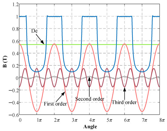 According to Equations (11) and (12), under no-load excitation, the composite magnetic density of armature winding cutting can be expressed as: