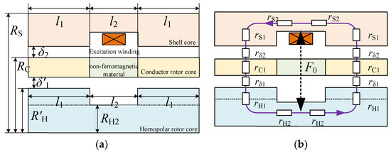 To consider the influence of different position saturation on the calculation of the inductance parameters, the magnetic circuit of the HTR-ASD needs to be calculated. Considering that the surfaces of each part of the HTR-ASD are equimagnetic potential surfaces, the calculation can be simplified using Carter’s coefficient. Figure 10 shows the calculation model of the homopolar-type rotor obtained by Carter’s factor.