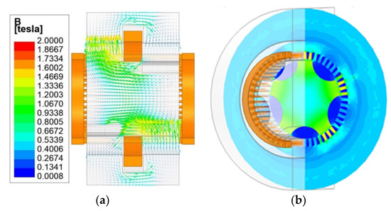 No-load magnetic field distribution of the axial and radial views. (a) The no-load magnetic field distribution of the axial view. (b) The no-load magnetic field distribution of the radial view.