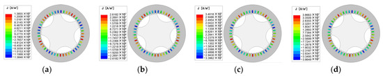Current density distribution under different slip speeds and an excitation current of 6A. (a) Slip speed = 40 r/min; (b) slip speed = 80 r/min; (c) slip speed = 120 r/min; (d) slip speed = 160 r/min.
