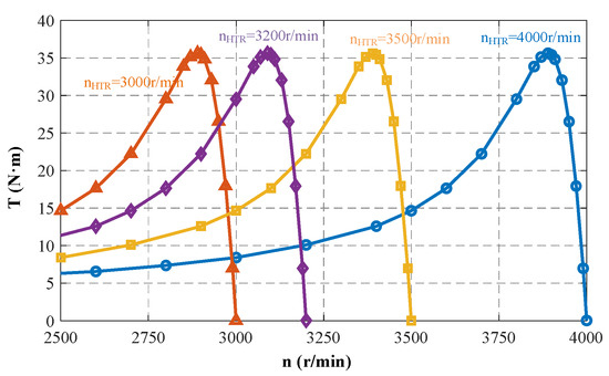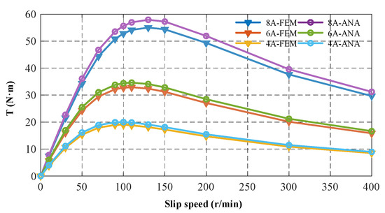 Figure 17 shows the output torque of the HTR-ASD under different slip speeds and excitation currents. From Figure 17, it can be clearly seen that the speed and torque of the HTR-ASD can be easily adjusted by changing the excitation current. Additionally, the output torque is proportional to the square of the current, which is similar to the characteristics of the voltage regulated speed control of an asynchronous motor. Through a comparison between the analytical calculations and simulations, the accuracy of the analytical analysis in this study is verified. Figure 18 shows the operating characteristics at different prime mover speeds. When the speed of the prime mover changes, its characteristics are like those of the variable frequency speed regulation of an asynchronous motor.