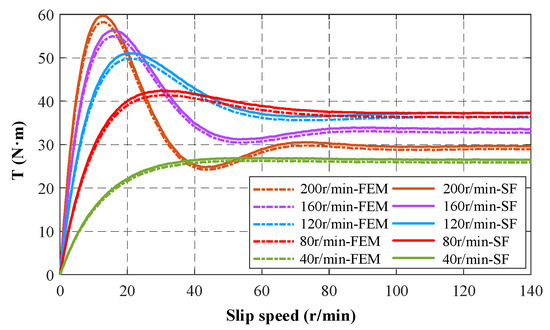When the inductance parameters of the machine are calculated, the transient torque response of the HTR-ASD can be obtained by the s-function simulation model, which is much quicker than the FEM. Figure 19 shows the transient torque response of the HTR-ASD calculated by the two methods under different slip speeds and an excitation current of 6A. As can be seen from Figure 19, the results of the two methods are basically consistent. Furthermore, the higher the slip speed, the longer the response time because of the larger current.