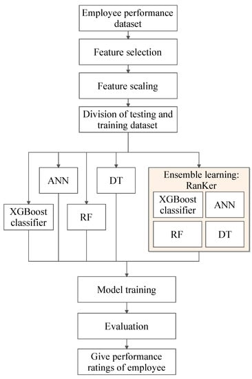 For the classification of employee performance, we have developed a system architecture in the form of a flowchart (as show in Figure 1) which shows the basic working of the system which begins with the considered employee performance dataset in which feature selection and scaling is applied to further perform the division of testing and training dataset. Further, conventional classification algorithms and the proposed approach is considered to train and evaluate the employee-performance ratings. Moreover, the dataset collection step was performed, then we selected the useful features from the available features in the dataset through the feature selection step. In addition, then, we used feature scaling to scale up the features. After that, the classification was performed using ML algorithms such as DT, RF, ANN, XGBoost, and AdaBoost. At last, we implemented a novel approach, RanKer, an ensemble-learning method, to achieve better results.