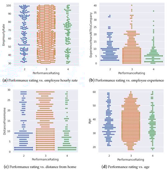 In addition, we also visualized a few data columns and their influence on the performance rating of employees (Performance Rating is the class label). For instance, the performance rating is compared with employee hourly rate, employee experience at the company, age, and distance from home. Figure 2a shows the comparison of employee performance and employee hourly rate, where the employee (rating = 3) shows an average performance with hourly rate; whereas the employee (rating = 2 and 4) has less affect on hourly rate. Similarly, the dataset has employees who have experience up to 20 years in the same company (as shown in Figure 2b, there are a few employees who possess up to 40 years of experience. Further, Figure 2 illustrates the comparison of performance rating with age and distance from home).