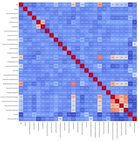 Any organization aims to have a lower attrition value because when an employee leaves the organization, some vital information also goes with them. This results in a massive impact on the productivity and work culture of the organization. Therefore, for any organization, it is essential to retain and adequately treat human resources; therefore, organizations need strategies to retain employees. That is where employee-performance measurement considering all factors plays an essential role. Techniques such as predictive analysis, which exploits the features based on the data for future research, can be used to predict attrition and employee performance using various artificial-intelligence (AI) techniques [5].