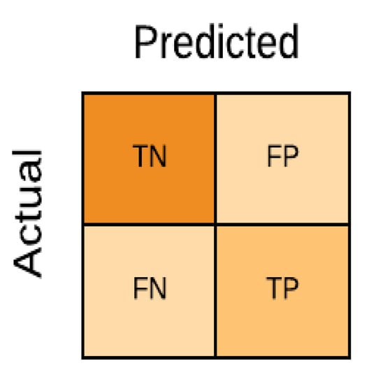 A confusion matrix is a clean and unambiguous way to represent the model’s predictions. It comprises of four parameters, such as true positive (TP), false positive (FP), true negative (TN), and false negative (FN) [35]. Let us consider an example of a model which predicts whether a person has a performance rating of a particular class or not. A confusion matrix is given in Figure 6.