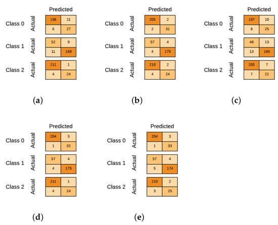 Confusion matrix comparison of the proposed scheme (a) DT, (b) RF, (c) ANN, (d) XGBoost classifier, and (e) ensemble learning: RanKer.