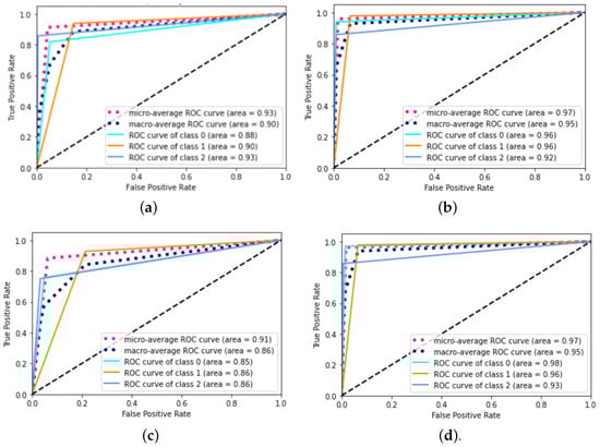 ROC Curve comparison of the proposed scheme. (a) DT, (b) RF, (c) ANN, and (d) XGBoost Classifier.