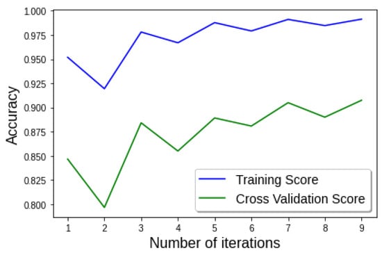 AI-based ensemble learning gives 96.25% accuracy when trained on the standard dataset. Figure 7e shows the confusion matrix for our model. Other evaluation metrics are shown in Table 3. The model achieves a precision of 91% for the class 0 rating, 98% for the class 1 rating, and 93% for the class 2 rating. Further, the model gets a recall of 97% for class 0, 97% for class 1, and 89% for class 2 rating. Similarly, F1-Score is calculated, i.e., 94% for the class 0 rating, 97% for the class 1 rating, and 91% for the class 2 rating. Moreover, the proposed Ranker is evaluated using a training and cross-validation score, where the training score specifies the accuracy score of the training dataset. To validate the accuracy of training dataset, we used cross-validation score using , which takes and of the training score. From the Figure 9, one can observe that at iteration 9, the training accuracy is ≈96.2% and validation accuracy is ≈91.34%. On further iterations, the gap between training and validation scores is going to be minimized and an optimal solution achieved.