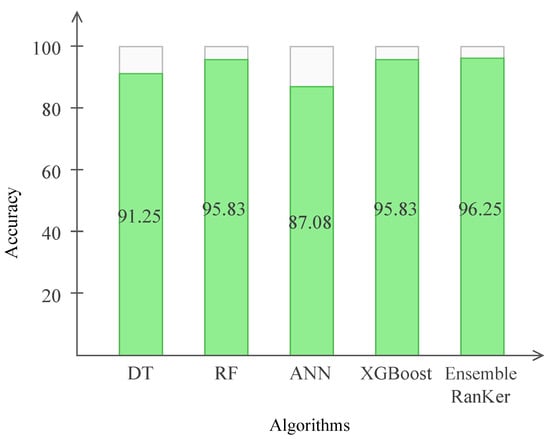 For the implementation of RanKer, we utilized the voting classifier approach, i.e., , using the standard scikit learn library (https://scikit-learn.org/stable/modules/generated/sklearn.ensemble.VotingClassifier.html, accessed on 12 August 2022). We used all these four implemented algorithms as estimators by combining them into a hybrid model. The uses to take input as estimators, which consists of all models (i.e., DT, ANN, XGB, RF). Here, we applied so that the proposed approach uses voting based on the predicted probabilities of the output class. In the soft-voting classifier approach, the probability of included individual models is summed, and the prediction with the largest sum is selected [33]. In addition, it is possible to give more weight to certain models in comparison to other models while using the soft voting classifier. Then, is used to transpose the output predicted probabilities. Further, the estimator is forwarded for training purposes by using . After training and testing the model on our dataset, we achieved an accuracy of 96.25%, which was higher compared to the conventional techniques we implemented before. The implementation of our RanKer approach is shown in Algorithm 2.