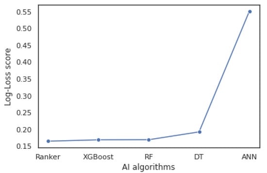 After implementing traditional ML and the proposed ensemble-learning RanKer, we compared their performance to find the best model. Figure 10 shows the accuracy measures of all the methods implemented on our test dataset for the employee-performance classification problem. It is clearly stated that RanKer has performed better than the other implemented methods by having an accuracy of 96.25%. RF and XGBoost come second by having an accuracy of 95.83% each. DT has also performed better by achieving 91.25% accuracy. While predicting employee-performance ratings, ANN has not performed up to the mark. From the above, it is concluded that our proposed ensemble approach works better when a huge number of parameters and features are considered for the employee-performance classification. Further, the proposed approach is evaluated using a log loss score, which specifies how close the predicted probabilities are to the ground-truth values. It also implies that the algorithm poses high accuracy, and must have a low log loss score. Here, the Ranker achieves 0.16477 log loss score value compared to other AI alogrithms (as shown in Figure 11). Thus, using this approach, the company could find low performers based on the parameters as stated in Table 2 so that the company could work to increase the working efficiency of the employees or can fire them, according to their requirements.