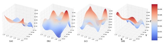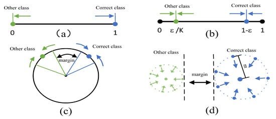 The softmax cross entropy (SCE) loss is a typical loss function used in training deep models, which imposes a hard constraint on the label of the input, i.e., regressing the probability of 1 on the correct label and the probability of 0 on the incorrect labels (generally in the case of one-hot label representation). Unfortunately, the hard constraint, on the one hand, causes a difficult regression process in training. On the other hand, it makes the resultant model over-confident on the predictions, hence bringing the issue of vulnerability. This has already been mentioned in the literature of label smoothing [33,34,35], which solved the problem by designing a soft label or a soft output distribution, i.e., regressing the probabilities of and on the correct and incorrect labels, respectively, where K is the number of task labels. As shown in Figure 2, (a) is the softmax cross entropy case, which regresses the probabilities from one side; (b) is the label smooth case, which regresses the soft labels from both sides; (c) is the ArcFace case, which regresses the targets on a circle axis in feature space, i.e., encouraging the circular margins between different classes; (d) is the inference softmax cross entropy case, which regresses the targets from all directions, i.e., encouraging the isotropic margins between different classes.