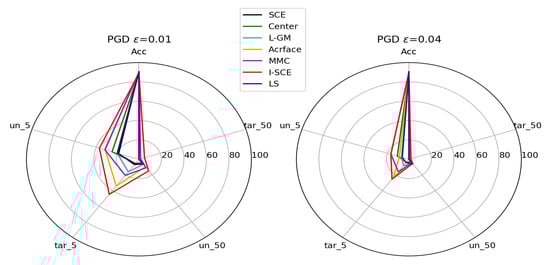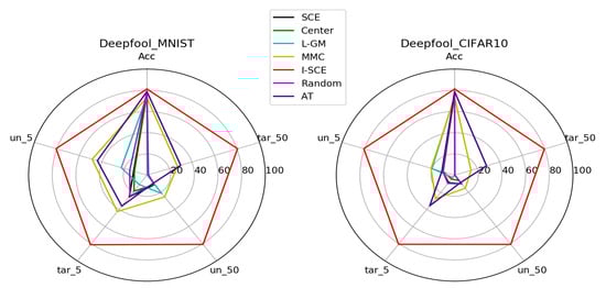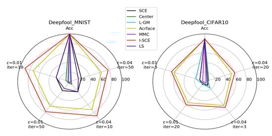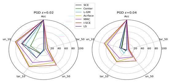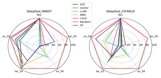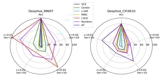 In this Section, we conducted a series of experiments on MNIST [38] and CIFAR-10 [39] to demonstrate the effectiveness of the proposed I-SCE. The MNIST and CIFAR-10 are classic data sets in image classification task. The MNIST is a handwritten digital dataset of 0–9, and the size of each picture is . The CIFAR-10 has 10 classes, and the size of each picture is . The backbone used in our implementation was ResNet-32, with five stages [40], which was optimized by using the Adam algorithm [41]. We employed the white-box attack and the black-box attack, including the targeted and untargeted PGD [18], Deepfool [19], and SimBA [20]. The white-box attack means that the attacker can obtain the network structure and weight of the model, whereas the black-box attack means that the attacker does not know the network structure and weight of the model. The untargeted attack means that the attacker only makes the neural network misclassify, whereas the targeted attack makes the neural network with a specific wrong class. In this paper, the specific wrong class of the targeted attack is the class with the lowest prediction probability of the model. We selected the state-of-the-art models as competitors, such as the center loss [15], the large-margin Gaussian mixture (L-GM) loss [16], ArcFace loss [36], the max-Mahalanobis center (MMC) loss [17], the random method [22], label smoothing [33], and the adversarial training (AT) method [18]. Extensive experiments show that the model trained by I-SCE is more robust compared with competitors.