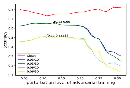 The PGD attack is a strong white-box untargeted and targeted attack. We used L2 constrained untargeted and targeted PGD attacks for comparison. The results are listed in Figure 5 and Figure 6. The Acc is the accuracy on clean examples, is the perturbation level, and PGD represents the targeted or untargeted attacks with 10 or 50 iterations. The results indicate that I-SCE produces a better performance than the others in most cases. In particular, under a attack, the accuracy of I-SCE is higher than SCE on the MNIST dataset. The accuracy of I-SCE is higher than center loss. The accuracy of I-SCE is higher than L-GM loss. The accuracy of I-SCE is higher than center loss. The accuracy of I-SCE is higher than MMC loss. While AT sometimes achieves a good performance, it has a noticeable sacrifice of accuracy on clean examples, e.g., on CIFAR10, and it has a weaker defense against strong PGD attacks than I-SCE. In constrast, I-SCE preserves a high performance on clean data. Under several attack cases, e.g., , I-SCE performs better than the others and is comparable with MMC and AT. In particular, considering the accuracy of AT in clean examples, we reduced the adversarial disturbance of AT to improve the accuracy; for example, as shown in Table 1 and Table 2, the adversarial disturbance of AT is with 10 iterations. Although AT is an effective method used to improve robustness, it can only learn the existing distribution of adversarial examples. When the adversarial disturbance of a PGD attack exceeds the adversarial disturbance of AT, we can find that AT does not have a good defensive effect on the PGD attack and AT does not learn the distribution of higher adversarial disturbances with higher iterations. In particular, we find that increasing the adversarial disturbance does not always improve the robustness during adversarial training. As shown in Figure 7, the X axis represents the perturbation level during adversarial training and the Y axis represents the accuracy of classification. The red curve is the classification accuracy of clean examples. The blue curve is the PGD attack with 0.03/10 (0.03 is the perturbation level of the adversarial attack, 10 is the iterations of the adversarial attack). Similarly, the green curve, sky-blue curve, and yellow curve represent 0.03/30, 0.06/10, and 0.06/30. Two point coordinates represents the maximum values of the green curve and yellow curve. When the robustness reaches the peak, the robustness of adversarial training decreased, with an increase in the perturbation level during adversarial training with ResNet-32. It shows that adversarial training cannot increase robustness without limitation via sacrificing accuracy. In addition, the two point coordinates of the curve’s maximum values indicate that the model cannot achieve the best robustness under different attacks. In general, adversarial training has an upper bound for robustness.