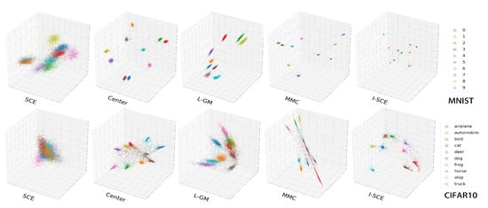 In the experimental part, we used different adversarial attack methods to verify the effectiveness of our method, including a white-box attack and black-box attack; under severe adversarial attacks, I-SCE still maintains a high accuracy and robustness and performs better. On the MNIST dataset, the accuracy of I-SCE is higher than SCE under the attack of ResNet-32. On the CIFAR-10 dataset, the accuracy of I-SCE is higher than SCE under the attack. Significantly, under the attack of LeNet-5, the accuracy of I-SCE is higher than SCE on the MNIST dataset and higher than SCE on the CIFAR-10 dataset. The I-SCE is above a accuracy compared with other methods on the MNIST dataset and accuracy compared with other methods on the CIFAR-10 dataset. In addition, we also verified the feature space embedding of different loss functions. Figure 9 shows that our method has a better inter-class separability; it is more difficult for adversarial examples to cross the decision boundary.