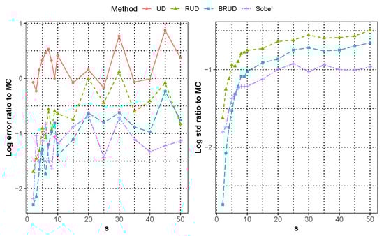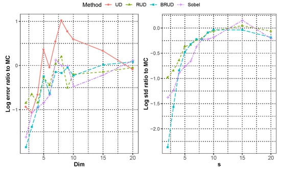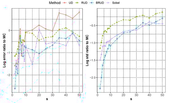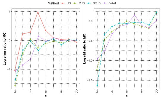 In this case, the function is a product of , where is the degree 6 Bernoulli polynomial and is the degree 5 Euler polynomial. It is a sufficiently smooth function, but differs from the previous functions in that it is non-separable and has a product parameter . Figure 7 and Figure 8 show the performance of different methods for the integration of . The BRUD method and Sobel method still perform well in terms of the estimation error, standard deviation, and convergence rate of order, and the BRUD method has a significant advantage in low dimensions, but the Sobel method is superior in high dimensions.