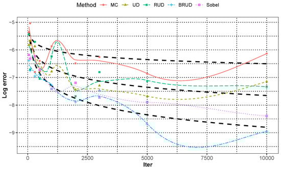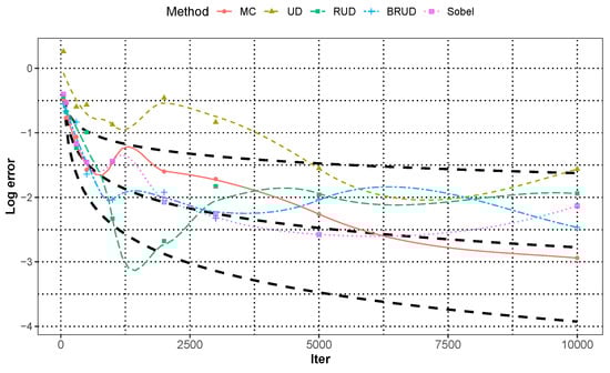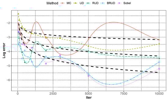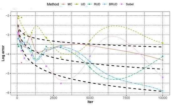For the integration of , Figure 1 shows the median approximation error for all runs in each dimension. For better presentation, we consider the approximate error on a scale, and add the comparison of the estimated standard deviation of the BRUD, RUD and Sobel method with MC method. We can see that the original UD method is inferior to MC method when the dimension is greater than 10, and the BRUD method obtains a consistent smaller error at all dimension than the MC, UD, and RUD methods, and shows a significant advantage compared with Sobol method when . In addition, BRUD method outperforms MC, RUD and Sobel method in terms of standard deviation, especially in the low dimensions. In order to compare the convergence speed of different methods, the approximation error of integration of in five dimension for each runs is shown in Figure 2, and it is smoothed by using the locally weighted regression for better presentation. The reference lines in Figure 2 are given at from top to bottom. In the five-dimensional case, both the Sobol and BRUD methods can nearly achieve the convergence rate of order , and the BRUD method has a slight advantage.