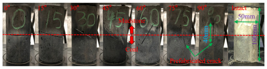 The mudstone and coal masses were prepared by using coal powder/sand, cement and water with a certain ratio. The ratio of coal powder, cement and water in the coal mass was 1:1:0.67, while the ratio of sand, cement and water in the rock mass was 1:1.5:1. For creating the uniform unconfined compression test specimens, the homogeneity distribution mixtures were poured into cylinder molds with a diameter of 50 mm and height of 100 mm. Meanwhile, a thin slice was inserted into the molds to form the prefabricated crack, with a length and width of 40 mm and 1 mm, respectively. As shown in Figure 1, the crack angle (θ) was selected as 0°, 15°, 30°, 45°, 60°, 75° and 90°. In addition, an intact specimen was also created as a reference. In all specimens, the height ratio of mudstone to coal was set as 1:1. Therefore, the prepared specimens had the advantages of high homogeneity and a controllable crack angle. The physical and mechanical parameters of the mudstone and coal masses in this study are shown in Table 1, and they were similar to natural coal and rock materials.