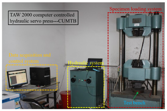 As shown in Figure 2, a TAW 2000 microcomputer-controlled hydraulic servo press, consisting of a specimen loading system, hydraulic system, control system and data acquisition, was adopted in this study. The unconfined compression test was conducted under a strain-controlled condition at a loading rate of 0.5%/min in accordance with ASTM D2166. In addition, during the loading process, a high-speed camera was used to record the process of cracks germinating, expanding and gathering and the joining up of microfissures until the specimen completely failed. Through the data acquisition and control system, the force displacement image was displayed on the computer screen in real time, and the data could also be exported to obtain the stress–strain curve of each specimen by using Origin. Moreover, for eliminating errors in the experimental processes, three replicates of each condition were performed to calculate the average values.
