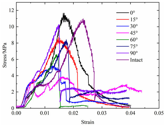Figure 3 shows the typical stress–strain curves of coal–mudstone specimens with different prefabricated crack angles. It can be observed that the slope of specimens with the occurrence of a prefabricated crack angle in the stage of elastic deformation was basically the same as that of the intact specimen. This indicates that the occurrence of a crack and its angle have limited influence on the elastic modulus of the coal–mudstone combined body. Moreover, the axial strain obtaining the maximum unconfined compressive strength of specimens with the occurrence of a prefabricated crack was smaller than that of the intact specimen. Additionally, with the increase in the prefabricated crack angle, the strain decreased first and then increased. Normally, all stress–strain curves slowly rise after the stage of elastic deformation, followed by a short period of the quadratic elastic deformation stage. This can be explained by the fact that the mudstone body part is still in the linear elastic deformation stage and has not completely failed, although the coal body part reaches the yield strength and enters the plastic stage.