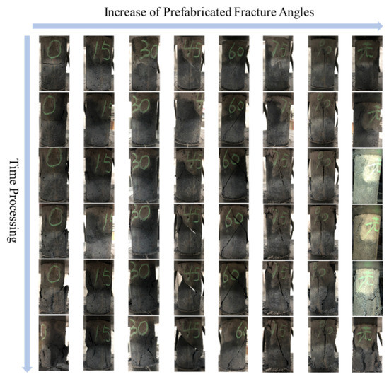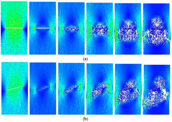Figure 4 shows all of the failure processes of specimens with different prefabricated crack angles and changing times. Obviously, the prefabricated crack gradually closed with the increase in loading displacement when the prefabricated crack angle (θ) was 0°. Additionally, compression shear failure could be observed in both ends of the prefabricated crack. After the crack was completely closed, the unconfined compressive strength (UCS) of the coal–rock combined body reached the maximum value. With the continuous loading, the UCS of the specimen decreased sharply with the occurrence of tensile and shear failure in the lower coal body, which resulted in the formation of several new near-vertical tensile cracks. In addition, the upper rock body near the crack was mainly shear failure. At θ = 15°, the failure processes of the specimen were basically consistent with those of θ = 0°, before the UCS reached the maximum value. However, after that, the UCS of the specimen decreased sharply with the occurrence of overall tensile and shear failure in the whole specimen, which resulted in multiple near-vertical tensile cracks running through the prefabricated crack. At θ = 30°, the prefabricated crack also firstly closed, and compression shear failure could be observed in both ends of the prefabricated crack during the closure process. After that, the UCS of the specimen began to decrease with the tensile and shear failure of the specimen, and the prefabricated crack continued to expand to both ends of the specimen, resulting in the generation of new inclined main shear cracks. At θ = 45°, compression shear failure could be observed in both ends of the prefabricated crack. After the crack closed completely, tensile shear failure in the lower coal body occurred with the formation of two main shear cracks. Moreover, one main shear crack was generated in the upper mudstone body. With the continuous loading, these cracks were further extended and accompanied by the sliding failure of the specimen along the direction of the prefabricated crack. Additionally, with the continuous increase in the prefabricated crack angle to 60° and 75°, the sliding failure of the specimen along the direction of the prefabricated crack was more obvious. Additionally, three main shear fractures were formed in both ends of the specimen with θ = 60°, while tension failure finally occurred in both ends of the specimen with θ = 75°. At θ = 90°, the prefabricated crack was vertically extended to both ends of the specimen to form a main tensile fracture.