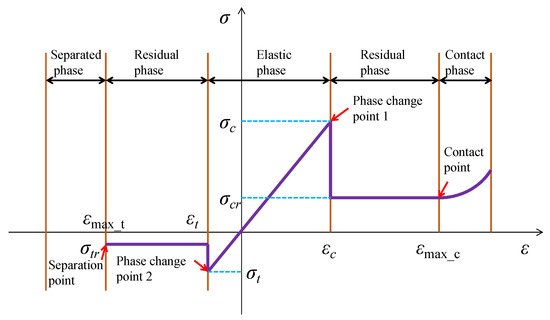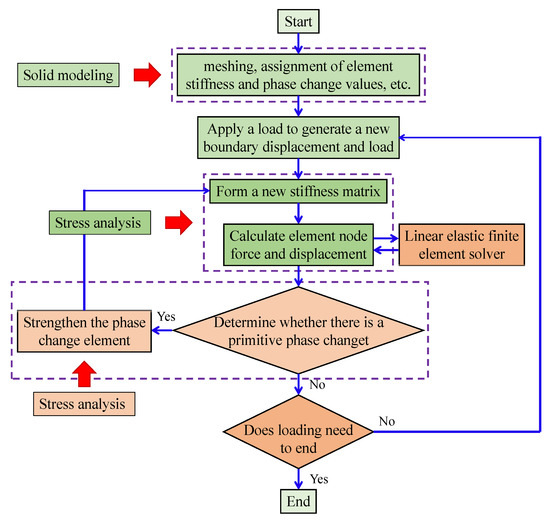 RFPA (rock failure process analysis) is a numerical calculation method of material failure process analysis based on finite element stress analysis and elastic damage theory. The whole working flow of RFPA is shown in Figure 5. For each given displacement increment, the stress and strain of each element can be calculated, and then the program can be transferred to phase transition analysis, which can be regarded as the checking stage regarding whether there is a phase transition in each element based on the phase transition criterion [13,26]. If not, a displacement component increases for the next stress calculation under continuous loading. If there is the occurrence of a phase transition in an element, the phase transition element will be treated by weakening the stiffness characteristics (e.g., crack or separation) or reconstructing the stiffness (e.g., compaction or contact) according to the type of phase transition, as shown in Figure 6. Subsequently, the stress and strain calculation of the current step is carried out again until no new phase transition element appears. Finally, the new physical and mechanical parameters of each element are formed for iterative calculation of the whole medium. The above processes are repeated until the applied loading and deformation cause a macro-fracture of the whole medium.