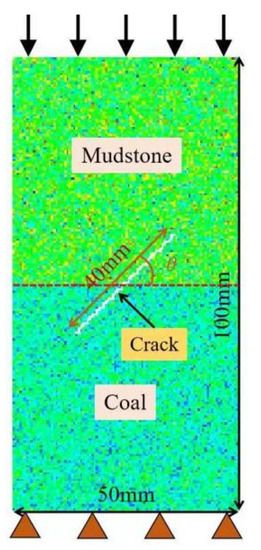 As shown in Figure 7, RFPA2D was adopted to build the coal–rock combined models, with a length of 100 mm and a width of 50 mm. The pre-existing crack was set up with a length of 40 mm and a width of 1 mm. Additionally, the whole model was divided into 200 × 100 grids. In terms of prefabricated crack angles, they were consistent with the experiment test conditions. The micro-mechanical parameters of the coal and mudstone masses were calculated from the macro-mechanical parameters of the experiment results, as shown in Table 2. In all specimens, the Mohr–Coulomb criterion and plane stress model were selected. In addition, the displacement increment was 0.02 mm each step because the stress–strain curves under this condition were consistent with the results of the experimental tests.