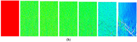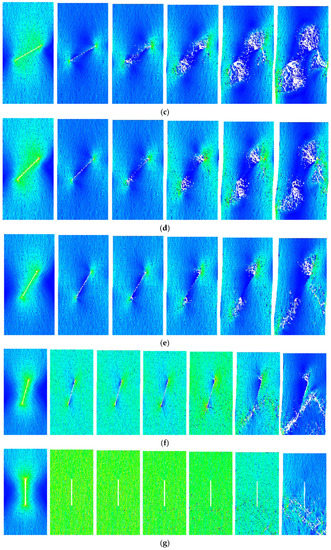 Stress evolution of coal–rock specimens with different prefabricated crack angles: (a) θ = 0°; (b) θ = 15°; (c) θ = 30°; (d) θ = 45°; (e) θ = 60°; (f) θ = 75°; (g) θ = 90°; (h) intact specimens.