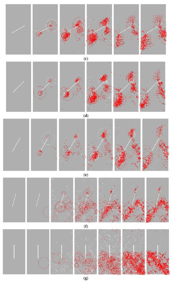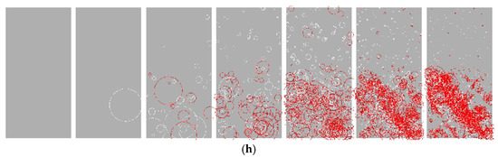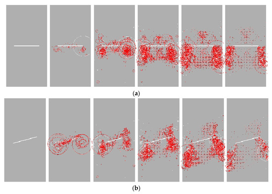 Figure 9 illustrates the acoustic emission evolution behaviors of the coal–rock combined body with different prefabricated crack angles. Additionally, the white and red circles represent tensile failure and shear failure, respectively. It can be observed that the acoustic emission appeared in both ends of the prefabricated crack at the initial loading stage when θ was in the range from 0° to 45°. With the continuous loading, the acoustic emission was more obvious with the increase in the acoustic emission number, indicating that the consumed energy increased with the gradual failure of the coal–rock combined body. Moreover, tensile failure mainly occurred around the crack and in the lower coal body, while the distribution of shear failure was relatively uniform in all of the specimens. However, when θ was in the range from 60° to 90°, the distribution of tensile failure was relatively uniform in all of the specimens, while shear failure could be mainly observed in the lower coal body. In terms of the intact specimen, it was found that tensile failure and shear failure mainly occurred in the upper rock body and the lower coal body, respectively.