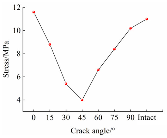 Figure 10 illustrates the change in the unconfined compressive strength (UCS) of the coal–rock combined body with the increase in the prefabricated crack angle. It can be observed that the UCS first decreased linearly from 11.6 MPa at θ = 0° to 4.1 Mpa at θ = 45° and then increased linearly to 10.2 MPa at θ = 90°. Therefore, the curve of UCS versus the prefabricated crack angle can be regarded as a V shape. It should also be noted that the UCS of the coal–rock combined body at θ = 0° was even slightly larger than that of the intact specimen (approximately 11 MPa).