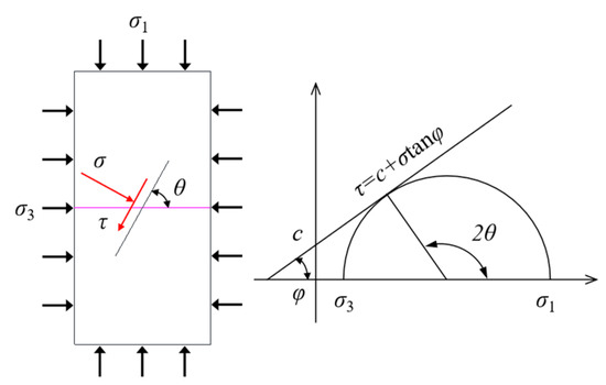 The variation in this strength with the increase in the prefabricated crack angle was related to the shear failure angle of the coal–rock combined body. Additionally, the stress analysis of the combined body with a prefabricated crack is shown in Figure 11. According to the Mohr–Coulomb failure criterion, the normal stress σ and shear stress τ acting on the fracture can be expressed as follows: