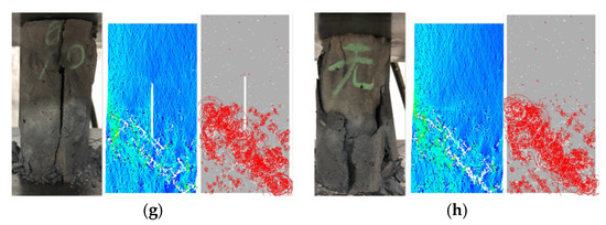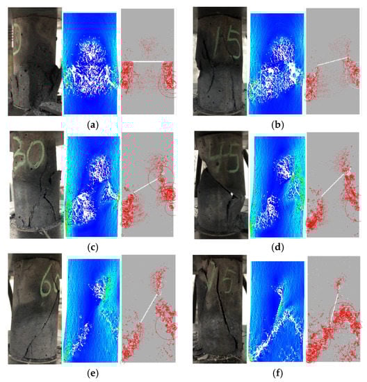 Combined with the results of the experimental tests and numerical simulation, the failure modes and acoustic emission diagrams of the coal–mudstone combined body with different prefabricated crack angles (e.g., 0°, 15°, 30°, 45°, 60°, 75° and 90°) are shown in Figure 12. Additionally, a group of intact coal–mudstone combined bodies was added as a reference. This illustrates that the failure of the lower coal body mainly caused the whole failure of the coal–mudstone combined body, and only a few cracks were generated around the upper tip of the prefabricated crack in the rock body. It can be stated that the resistance strength of the coal mass was mostly small, and its homogeneous degree was low, causing the breakage of the lower coal body first in the initial axial loading process. With the continuous loading, only a few cracks formed in the upper rock body, with larger resistance strength and a higher homogeneous degree. Overall, the strength of the whole coal–rock combined body was relatively small. Additionally, the fissure preferred to be expanded in the lower coal body. Moreover, the stress concentration can also cause the generation of a few new cracks near the prefabricated crack tip in the upper mudstone body.