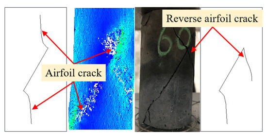 Throughout the literature, the crack propagation of rock-like materials at the crack tip is divided into airfoil cracks and secondary cracks under unconfined compression conditions [41]. Airfoil cracks initially germinate at the crack tip with a certain angle and develop towards the direction of the maximum principal stress. Generally, the airfoil cracks of the rock specimen with the occurrence of a prefabricated crack were distributed in the upper and lower directions of the prefabricated crack and were roughly parallel to the direction of the loading force under unconfined compression conditions. In terms of the coal–rock combined body, different airfoil cracks could be observed, where, although the airfoil cracks initially germinated at the tip of the prefabricated crack, two main cracks were distributed on one side of the prefabricated crack. Due to the upper part of the prefabricated crack in the mudstone body having higher strength, the two crack tips generated reverse airfoil cracks with the continuous loading. Moreover, the cracks tended to expand in the direction of the lower coal body with lower strength, as shown in Figure 13. Obviously, when θ = 0°–75°, a “reverse airfoil crack” was prone to occur.