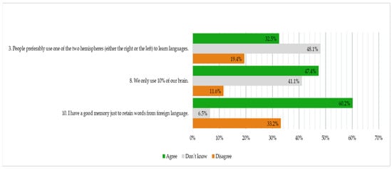 On the other hand, the results show that the correct answers of the participants, with an acceptance of the items above 50%, referring to brain plasticity and the acquisition of language learning (item 1). As for other myths related to dimension 3, the respondents recognized the need for social interaction to foster effective language learning (item 4), and they admitted that the knowledge of a foreign language does not hinder learning new languages (item 5) and that simultaneous learning of the mother tongue and other foreign language(s) at an early age does not interfere with the mastery of those languages, as indicated in item 11. According to Rato, Abreu, and Castro-Calda [], this myth affirms the false idea that languages compete, and that the first language must be learnt properly before learning other language(s). Furthermore, this study affirms that the participants have overcome the neuromyths stated by Paredes [].