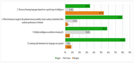 The univariate analysis of the items that make up the second dimension shows that the participants in the study are convinced of the influence of multiple intelligences, learning styles, and sensory modality on language learning (Figure 2). Likewise, there is a clear increase in the number of Agree responses for the items 6, 9, and 12. A total of 58.44% thinks that multiple intelligences contribute to language learning; some 79.6% considers that the use of the preferred sensory modality has an impact on better academic performance, and the vast majority (83.63%) believes that learning styles are determinant for learning. In fact, the answers given to item 2 indicate that slightly more than a third of the participants (34.5%) think that the ability to learn foreign languages is conditioned by some specific type of intelligence, compared to 53.7% who rightly thinks the opposite.