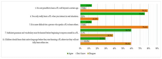 Finally, in the responses to item 11, Children should learn their native language before they start learning a foreign language otherwise they will not fully learn either on, more than half of the respondents (59.4%) believe that the learning of a foreign language is conditional on the prior acquisition of the mother tongue, compared to almost a third of the respondents (29.5%) who think the opposite (see Figure 3).