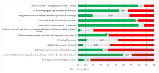A two-part questionnaire was developed (Appendix A). The first part asked for personal and academic data related to language learning and ability, and the second part offered 12 items presented in the form of statements, with respondents having to answer by choosing one of three options (Agree, Disagree or Don’t know). Following the aims of the present study, the items were selected and adapted from existing questionnaires (Appendix B), such as the BALLI instrument, The Beliefs About Language Learning Inventory [], the Neuroscientific Literacy Study [], and others that have been evaluated in various countries [] (p. 15) [,].