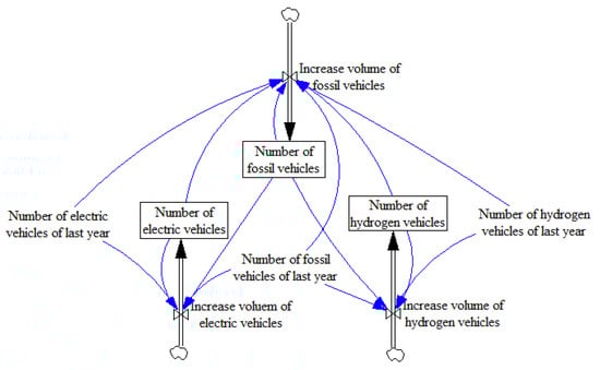 For the vehicle subsystem, the architecture of the LV model is illustrated in Figure 5. In the LV model, fossil fuel vehicles play as prey, and electric and hydrogen vehicles play as predators in the vehicle market.
