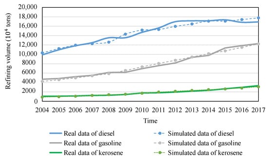 To verify the simulation model of the petroleum industry subsystem, we compared the empirical data and simulated data of the diesel refining volume, gasoline refining volume, and kerosene refining volume from the years 2004 to 2017 in Figure 11. Due to limited statistical data, the data of naphtha refining volume used in Figure 12 are from the years 2011 to 2017. The MAPE values of diesel refining volume, gasoline refining volume, kerosene refining volume, and naphtha refining volume are 3.4%, 4.62%, 6.36%, and 5.3%, respectively, and the RMSE values are 578.19, 372.46, 128.78, and 257.93, respectively, because the evolution of fossil fuel vehicles directly influences the fuel demand of diesel and gasoline. Combing the output results of the competitive scenario of the vehicle subsystem, the simulated refining volume of the petroleum industry from 2004 to 2030 is shown in Figure 13.
