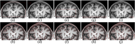 Next, in order to prove that our segmentation results are more robust, we use our model on Figure 3 to segment images under different noise conditions and compare with the CV model, the LBF model, the LIC model, and fractional order differentials with fixed orders of 1.5 and 0.5. We use MATLAB’s imnoise function to obtain two kinds of noise with variance values of 0.01 and 0.02, respectively. The variance noise of the first row is 0.01, and the noise of the second row is 0.02. It can be seen from Figure 3e,g that the added noise with a variance of 0.01 has a bad influence on the LBF model and the 0.5-order segmentation results. For the LIC model (see Figure 3c,d), the addition of noise with a variance of 0.01 has a slight impact on the segmentation results, but the addition of noise with a variance of 0.02 has a very obvious impact on the segmentation results. When the fractional order is 1.5 (see Figure 3i,j), adding noise with variance of 0.01 has an impact on the internal segmentation results of the image, and adding noise with variance of 0.02 has more effect on the segmentation result than other models. Compared with other models, our model can withstand part of the influence of noise and obtain better segmentation results.