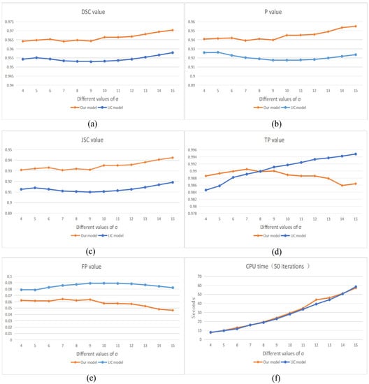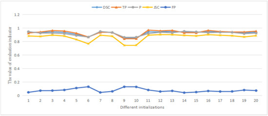 The first experiment shows the performance of our model under different initial contours. It has been proved that our model is not affected by the initial contour. TP represents the number of positive classes that are correctly predicted to be positive, and FP represents the number of negative classes that are incorrectly predicted to be positive. From the corresponding values of TP and FP in Figure 2 when the abscissa is 7 or 11, it can be seen that as the number of positive classes correctly predicted as positive classes increases, as the number of negative classes are incorrectly predicted as positive classes decreases, the value of P will increase; however, from the corresponding values of TP and FP in Figure 2 when the abscissa is 9–10, as the number of positive classes correctly predicted as positive classes decreases, as the number of negative classes are incorrectly predicted as positive classes decreases, the value of P will also increase. In addition, we can see that the overall trend of DSC, P and JSC remains the same, and the change of JSC is greater than that of DSC and P, indicating that JSC is more sensitive to changes in pixel set classification than DSC and P.